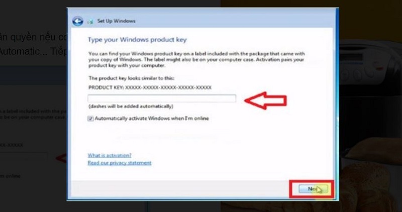 Khởi động lại máy tính thành công, bạn sẽ được yêu cầu điền thông tin tài khoản thiết bị. Điền xong những thông tin cần thiết hãy chọn Next để chuyển sang giao diện tiếp theo. Tại đây bạn sẽ được hỏi về thông tin Type your Windows product key, nếu bạn có mã bản quyền thì hãy nhập vào ô PRODUCT KEY. Còn nếu không có thì bạn hãy bỏ tích tại ô Automatic... và nhấn chọn Next nhé.