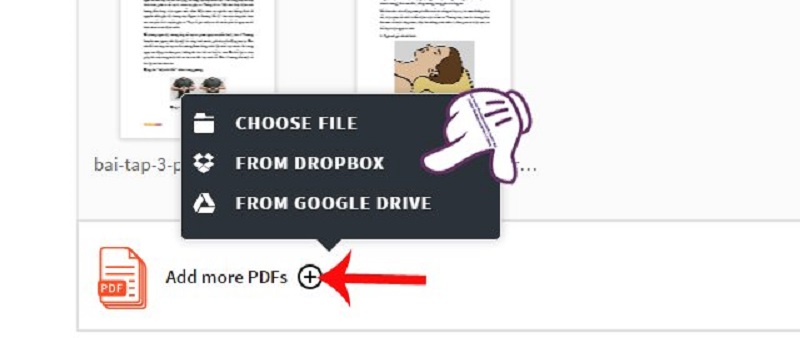 Khi bạn muốn tải thêm file, hãy nhấn vào mục Add more PDFs ở phía dưới. Bạn có thể thực hiện bằng 3 cách: Choose file, From Dropbox hoặc From Google Drive.
