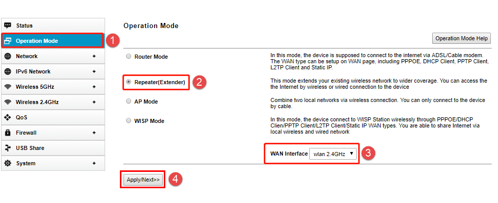 Đi đến Operation Mode ->Repteater Mode->wlan 2.4GHz hoặc wlan 5GHz