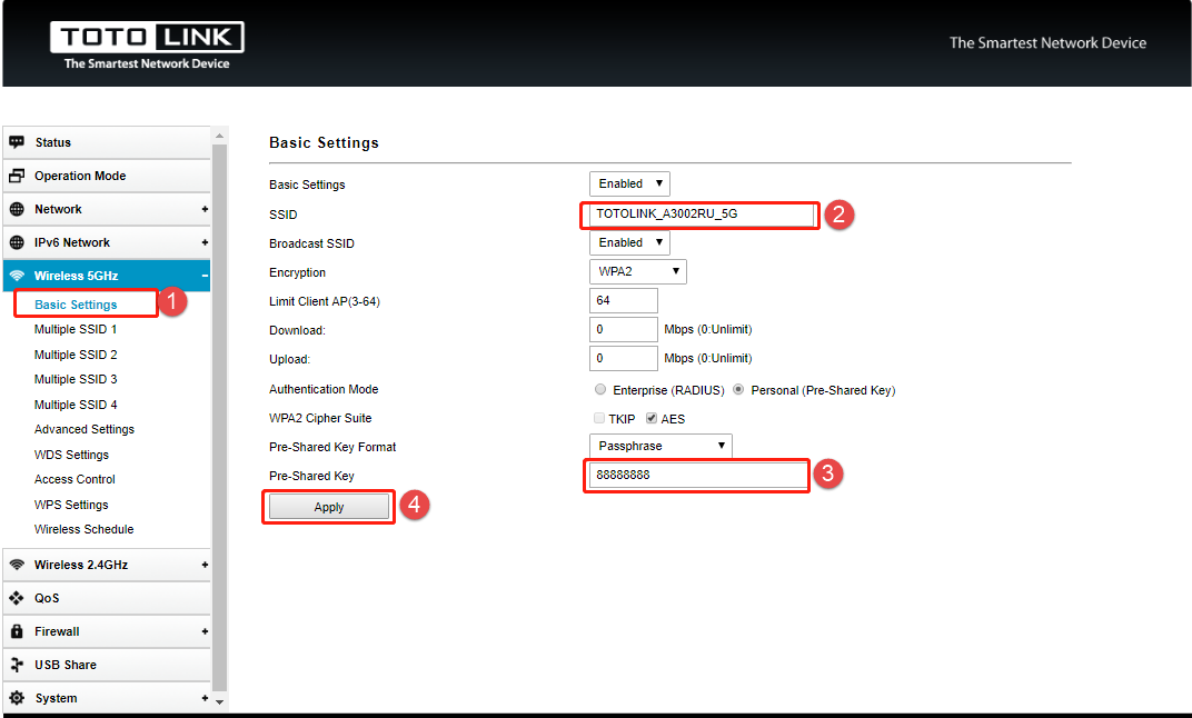 Nhập SSID và Password vào mục sóng Wi-Fi 5GHz, sau đó nhấn Apply.