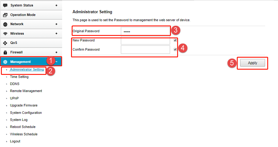 Nhấn vào Management->Administrator Setting trên thanh điều hướng bên trái. Trên giao diện đó, bạn có thể đổi mật khẩu mới sau khi bạn nhập đúng mật khẩu cũ. User name và password mặc định là admin.