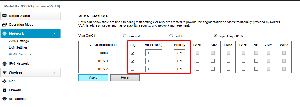 Nếu đường mạng hiện tại có hỗ trợ VLAN TAG thì bạn cần kiểm tra Internet Tag và IPTV Tag, sau đó bạn cần phải nhập vào VID cho các dịch vụ khác nhau (VID được cung cấp bởi nhà mạng). Nếu bạn muốn cài đặt một số cổng cho dịch vụ IPTV (vd: port1), bạn nên theo các bước dưới dây để cài đặt.