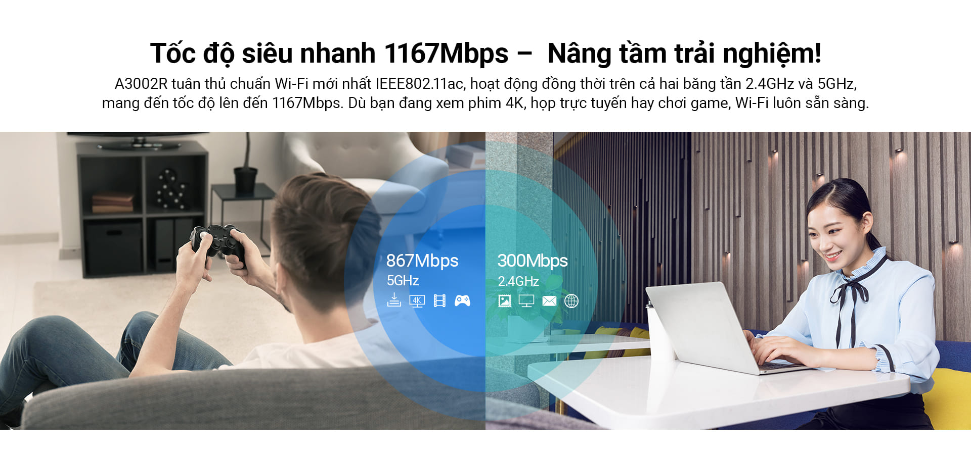 - Chuẩn Wi-Fi IEEE 802.11ac Wave 2, tốc độ 1167Mbps (867Mbps trên 5GHz, 300Mbps trên 2.4GHz)